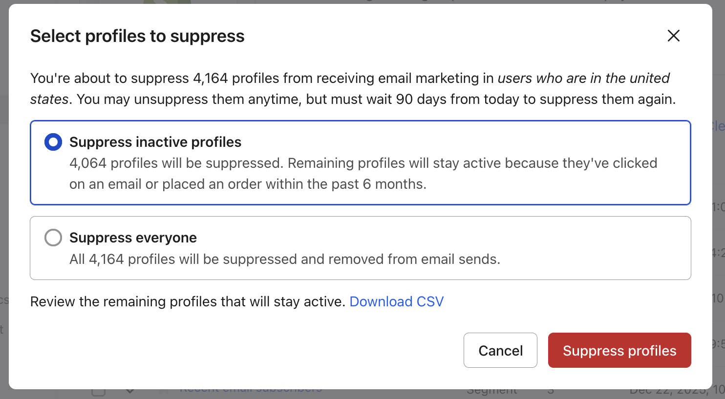 Si el grupo incluye perfiles que cumplen los criterios siguientes, Klaviyo mostrará una ventana modal con dos opciones antes de aplicar la acción. El modal resume cuántos perfiles se suprimirán y te permite revisar un grupo de perfiles para considerar mantenerlos activos, ya que cumplen con los criterios del modal sobre perfiles recientemente activos. Puedes elegir:
