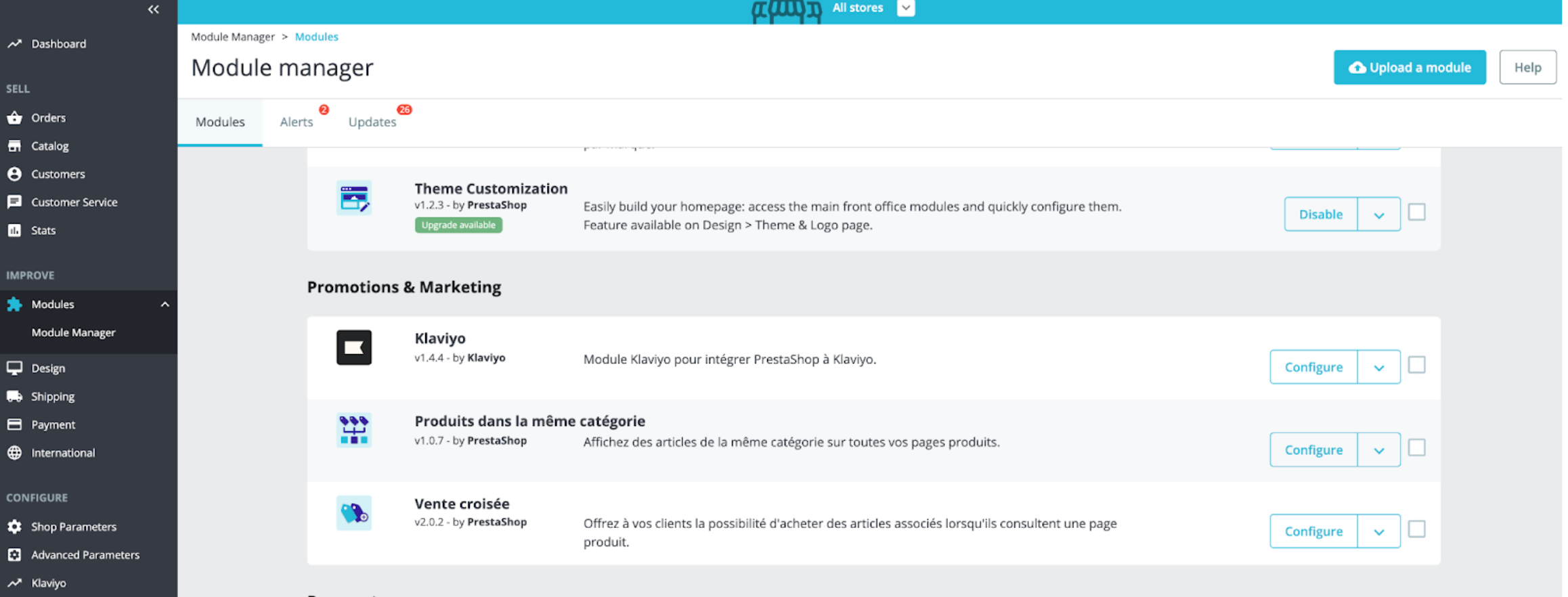 Klaviyo'cupón único funciones/características para PrestaShop requiere la versión 1.5.0 o superior del complemento Klaviyo para PrestaShop. Puedes comprobar la versión de tu complemento Klaviyo en PrestaShop en Módulos > Módulo Gerente.