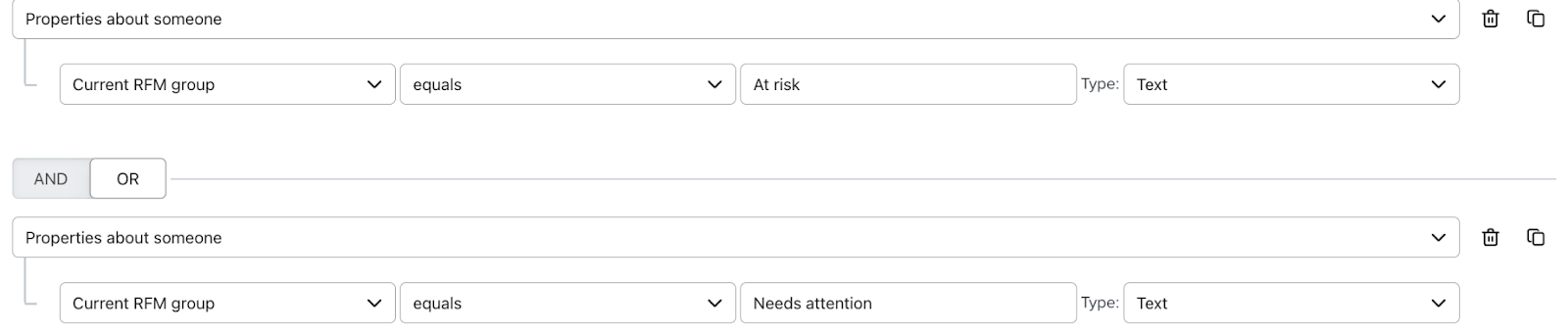 Una vez hecho esto, los 2 primeros pasos de tu segmento deben parecerse a los siguientes e incluir a cualquiera que esté en tus grupos Necesita Atención o En Riesgo. - Opcional: Los grupos En Riesgo y Necesita Atención pueden incluir a quienes hayan realizado al menos una compra en el pasado. Sin embargo, si quieres dirigirte a clientes que han comprado un determinado número de veces en el pasado (por ejemplo, sólo compradores únicos), pero que ahora están en los grupos En riesgo o Necesita atención, puedes utilizar la condición +Añadir para añadir un conector Y.