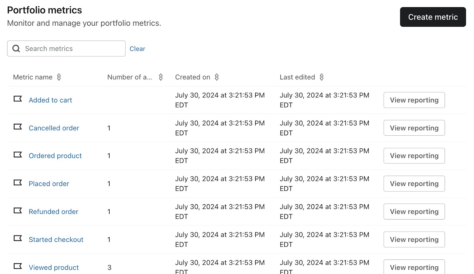 Un icono de una bandera Klaviyo al lado de cada una denotará estas métricas por defecto, junto con el número de cuenta al que se aplica esta métrica, y cuándo se creó la métrica.