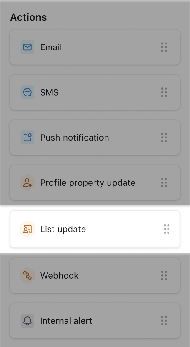 Utilizando la acción Actualizar lista, puedes cambiar en qué lista específica está alguien sin necesidad de actualizarlo manualmente ni de crear un segmento. Esto permite a un perfil iniciar un nuevo viaje tras completar el actual, y puede reducir la cantidad de lista y segmento utilizados en tu cuenta.