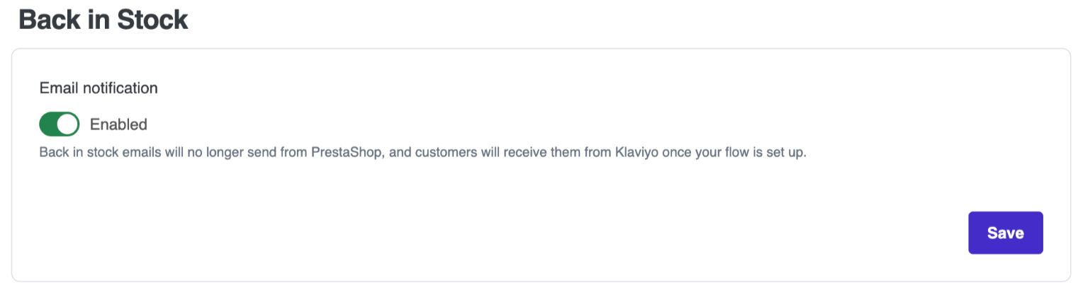 - Activa el conmutador de notificación de correo electrónico para activar el envío de reposición de stock de correo electrónico en Klaviyo. Ten en cuenta que al activar el conmutador también se desactivará el envío de reposición de stock de correo electrónico desde PrestaShop.