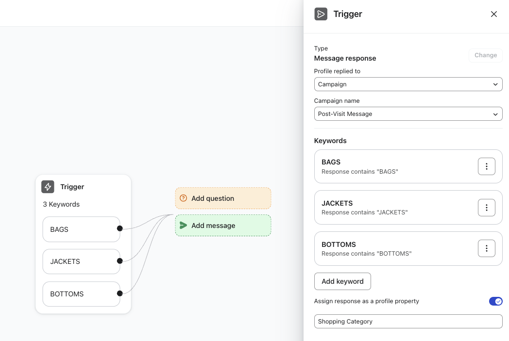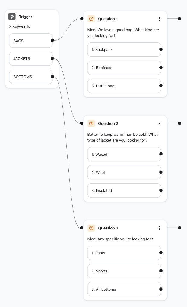 - Por ejemplo, agregar la misma pregunta o mensaje de todas las palabras clave: o un solo mensaje si alguien responde con "Bolsos" " Chaquetas" o "Pantalones"