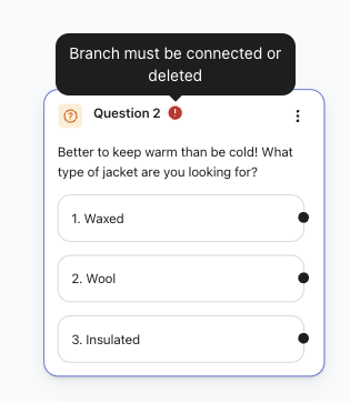 - Después de agregar una pregunta, puedes agregar otra tarjeta que se ramifique a partir de una opción de la pregunta. La ruta ramificada puede ser una pregunta, un mensaje o una recomendación.