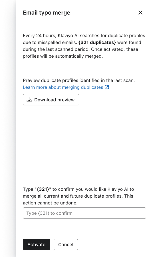- Te recomendamos encarecidamente que descargues una vista previa antes de activar cualquier regla de fusión, para cerciorarte de que comprendes cómo se agruparán y fusionarán los perfiles tras la activación.