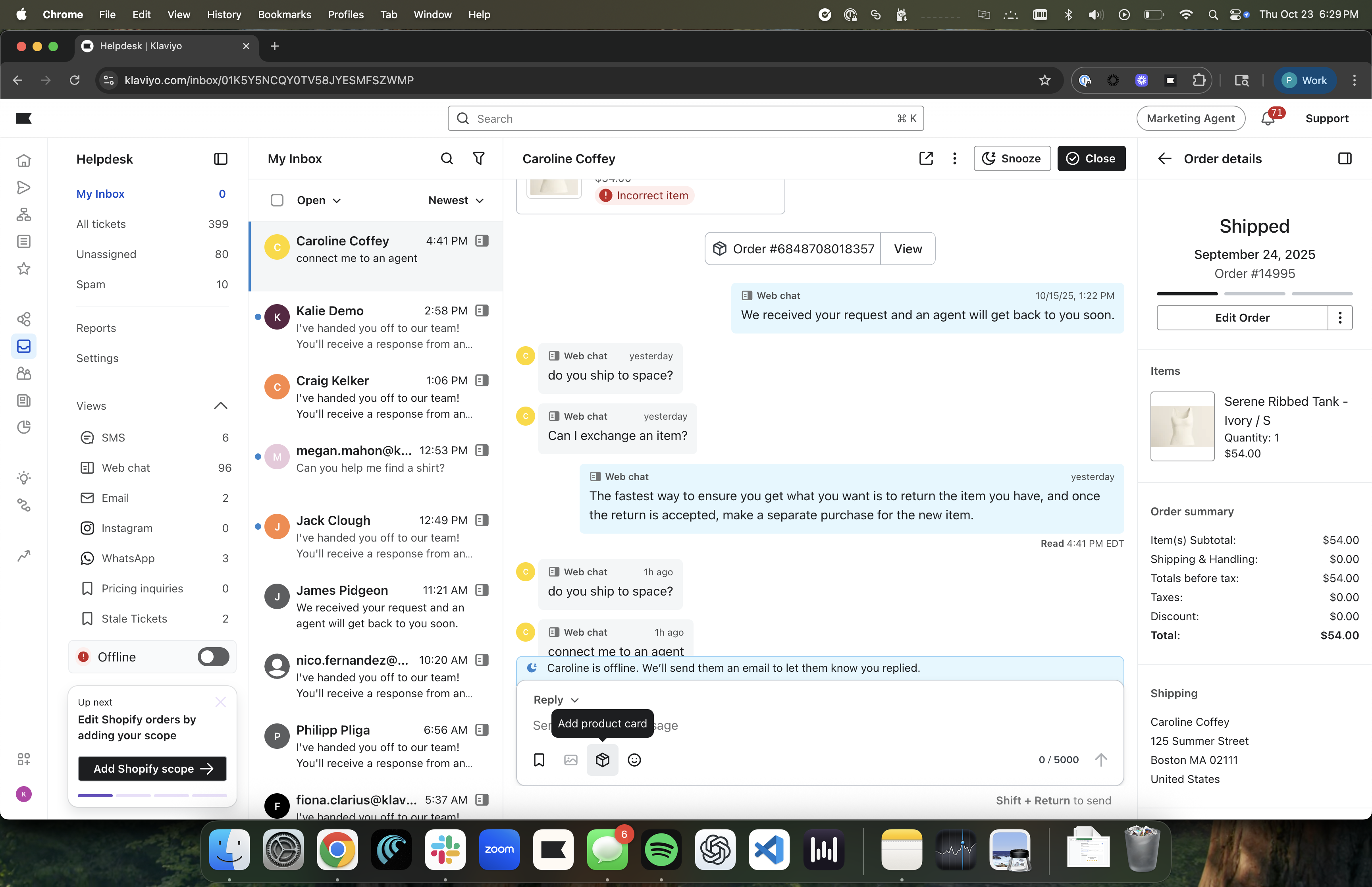 Nota: Las tarjetas de producto solo se muestran en WhatsApp y Webchat. Si envías la misma respuesta de ticket por correo electrónico o mensaje de texto, los destinatarios verán un enlace y una imagen sin formato.