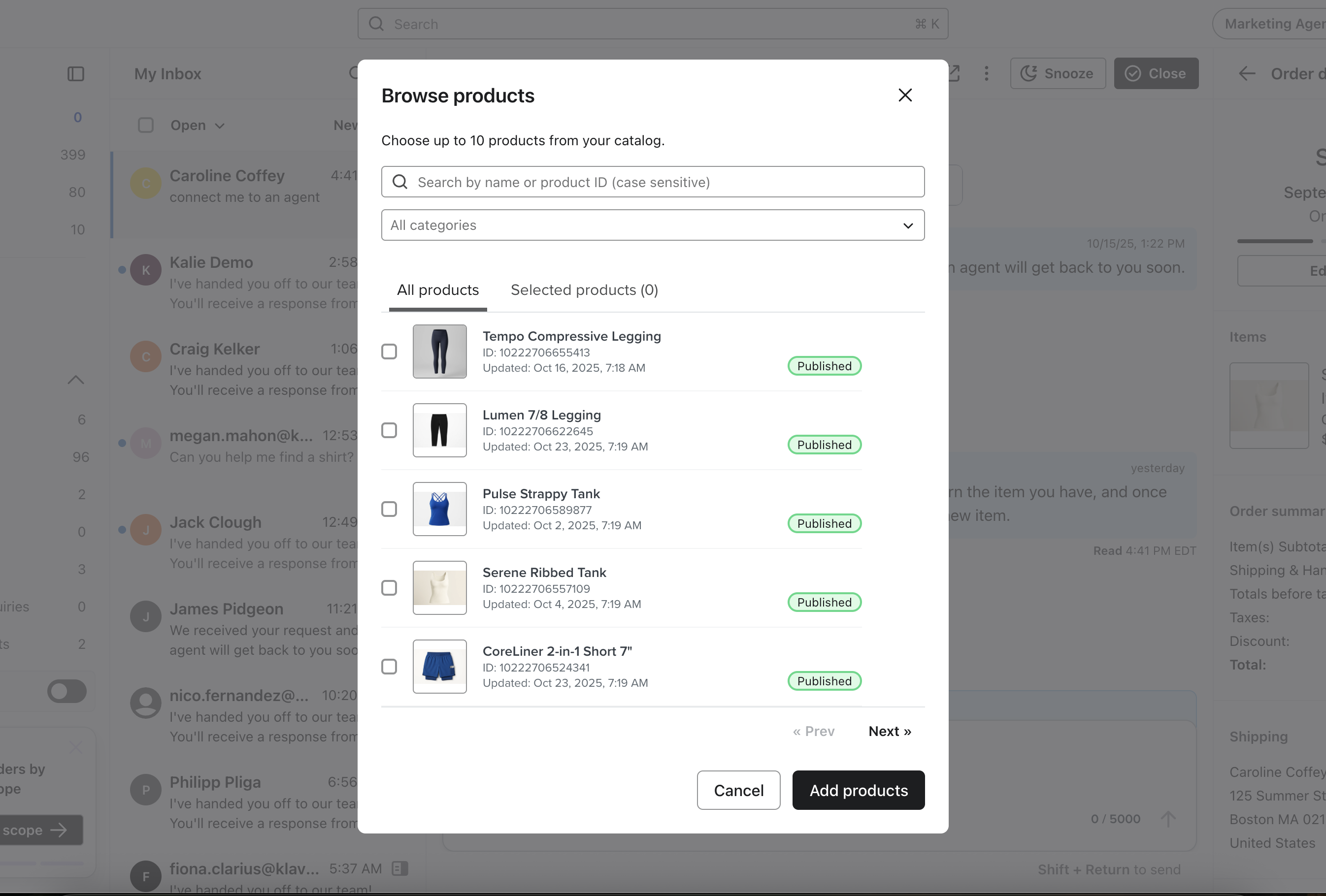 - En el modal Selector de productos, escribe para buscar los productos adecuados o filtra por categoría.