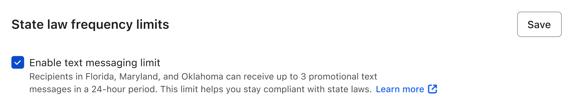 Los límites de frecuencia establecidos por la ley estatal están activados de forma predeterminada, y recomendamos dejarlos habilitados si envías mensajes de texto a suscriptores de EE. UU. en Florida, Oklahoma, Oregón o Maryland.