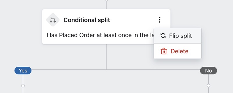 Si vous avez accidentellement placé des messages pour le chemin « OUI » dans le chemin « NON » ou vice versa, glissez-déposez les messages individuels dans le bon chemin. Si tous les messages se trouvent dans le mauvais chemin, inversez le fractionnement en cliquant sur le bouton d’action à droite du fractionnement et en sélectionnant Flip split.