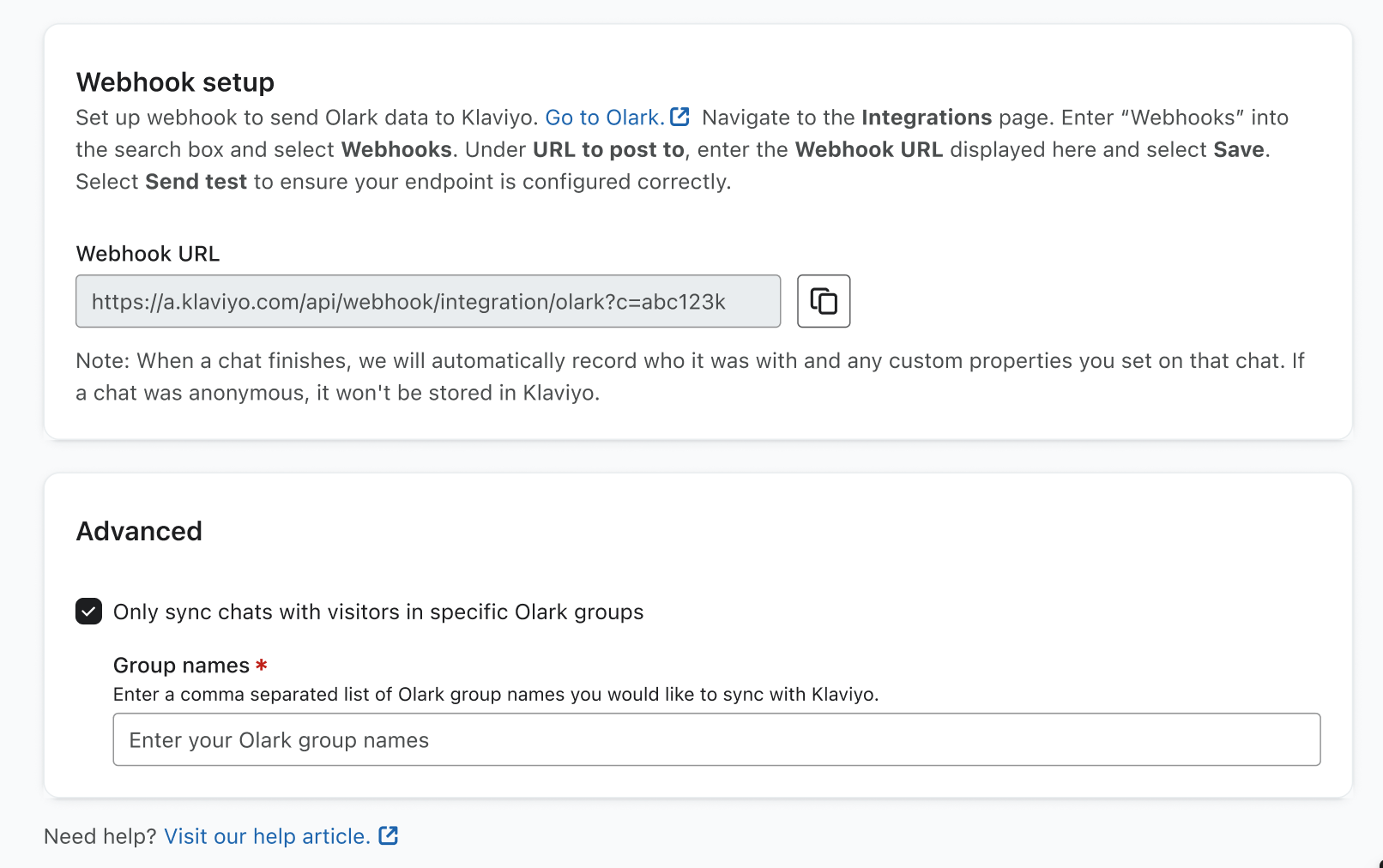 - Si vous préférez synchroniser des chats spécifiques avec Klaviyo, cochez l'option Ne synchroniser que les chats avec des visiteurs appartenant à des groupes Olark spécifiques. Ensuite, ajoutez les noms des groupes que vous souhaitez synchroniser dans Klaviyo, en les séparant par des virgules. Vous pouvez profiter de cette fonction lors de vos premiers pas, ou revenir plus tard pour ajuster vos paramètres d'intégration.