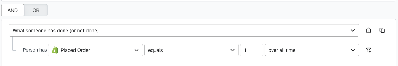Ensuite, les 2 premières étapes de votre segment devraient ressembler à ce qui suit et inclure toutes les personnes qui font partie de vos groupes Needs Attention ou At Risk. - Facultatif : les groupes At Risk et Needs Attention peuvent inclure les personnes qui ont effectué au moins un achat dans le passé. Toutefois, si vous souhaitez cibler les clients qui ont acheté un certain nombre de fois dans le passé (par exemple, uniquement les acheteurs ponctuels), mais qui font maintenant partie des groupes At Risk ou Needs Attention, vous pouvez utiliser l’option + Ajouter une condition pour ajouter un connecteur ET.