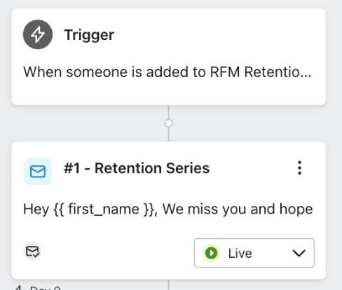 Vous pouvez explorer la bibliothèque de flux pour utiliser l’un des modèles préconçus ou suivre le guide ci-dessous pour créer un flux de rétention personnalisé. Dans les deux cas, il est important de déclencher vos flux en fonction de vos segments de groupe RFM.