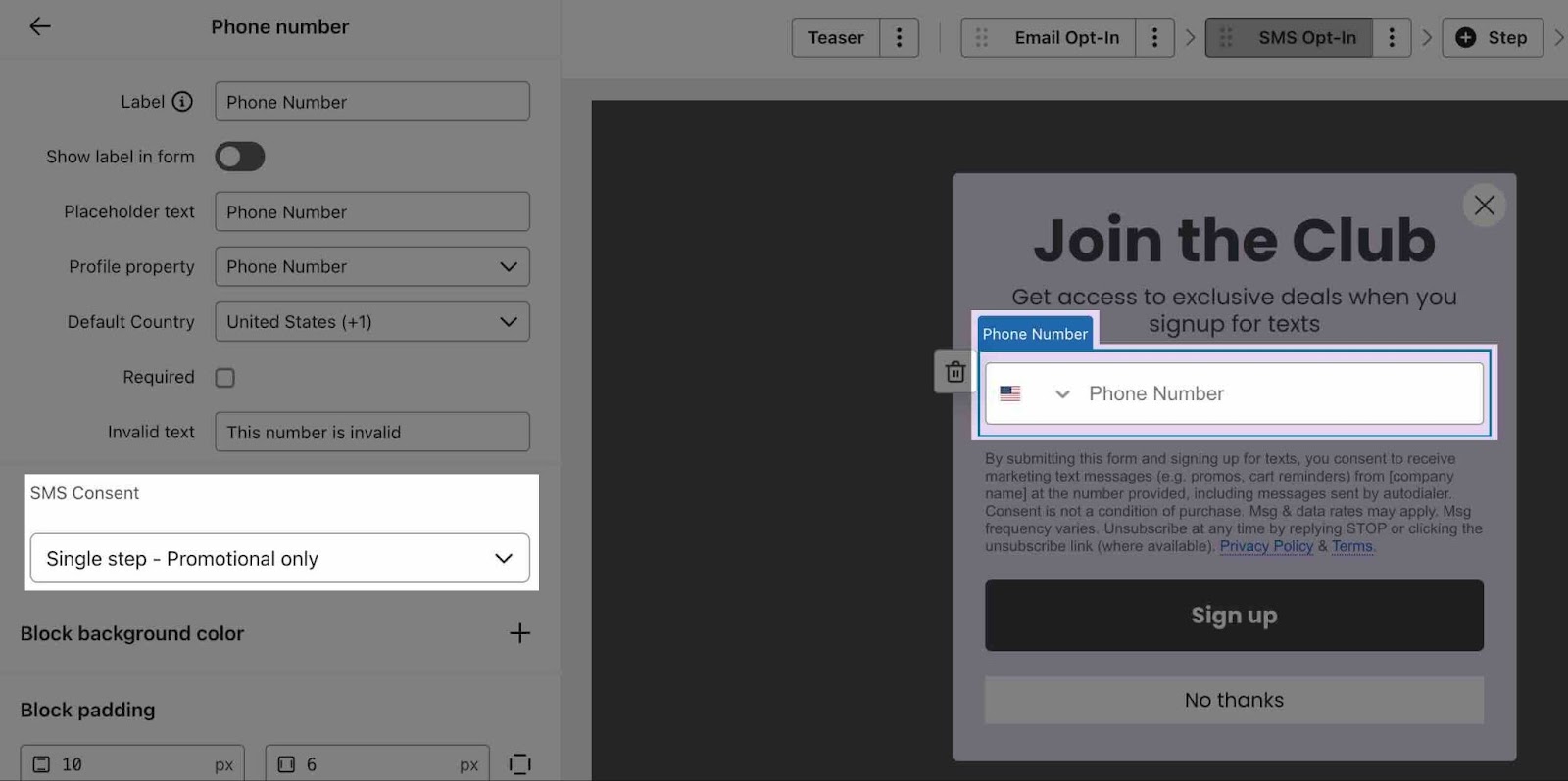 Suivez les étapes ci-dessous pour apprendre à créer un formulaire qui recueille le consentement transactionnel pour l'envoi de SMS. Notez que l'ajout d'un consentement transactionnel à un formulaire supprime toute fonctionnalité Smart Opt-in ou tap-to-text, car celles-ci ne peuvent pas être utilisées en même temps que le consentement transactionnel.