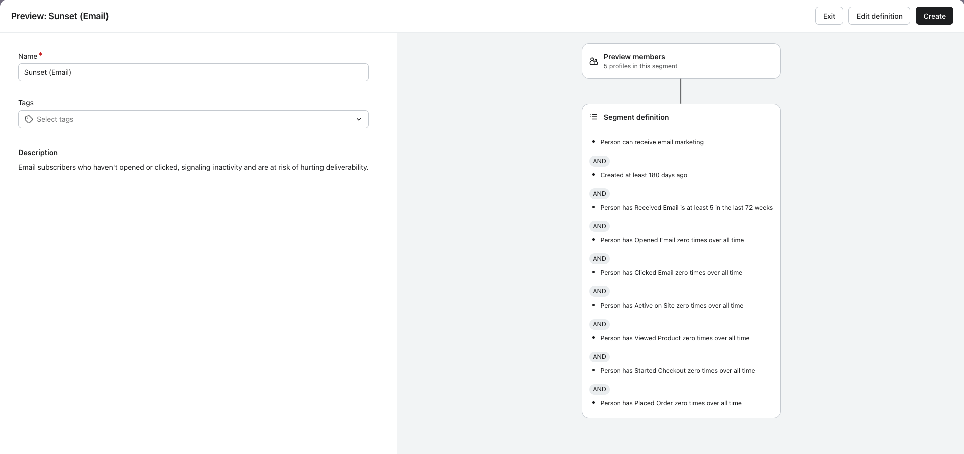 Lorsque vous le sélectionnez, vous verrez la définition suivante du segment final (Email) et pourrez le nommer et ajouter des tags.