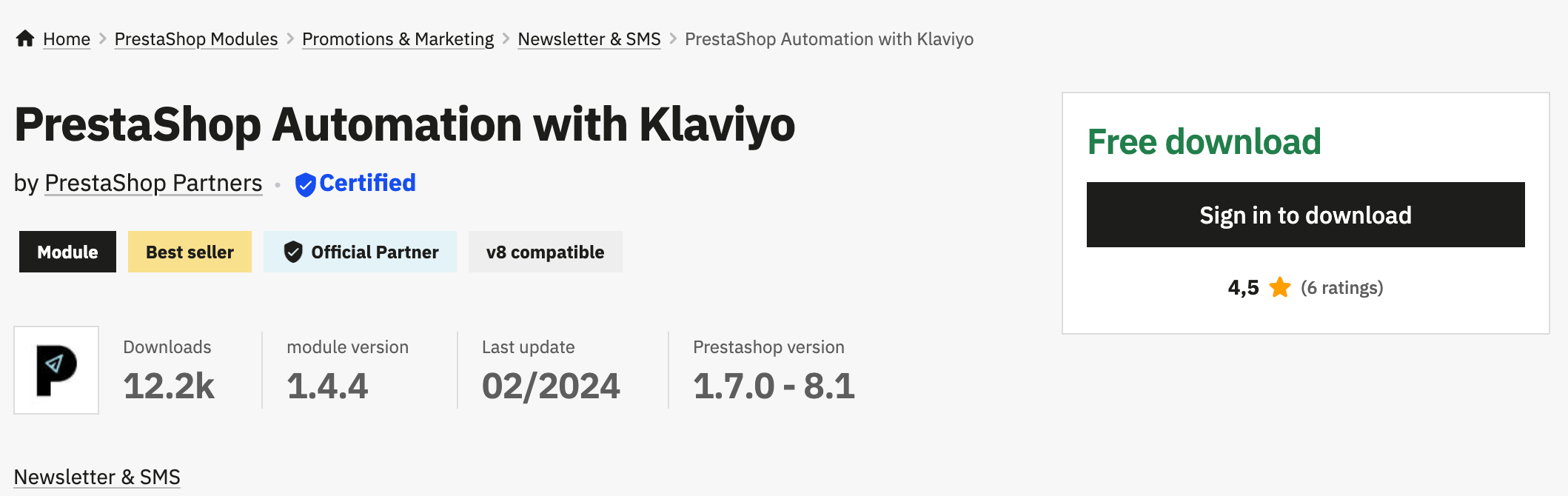 - Si vous n’utilisez pas PrestaShop Edition, accédez à la page du module PrestaShop Automation with Klaviyo sur la marketplace de PrestaShop et passez à l’étape suivante.