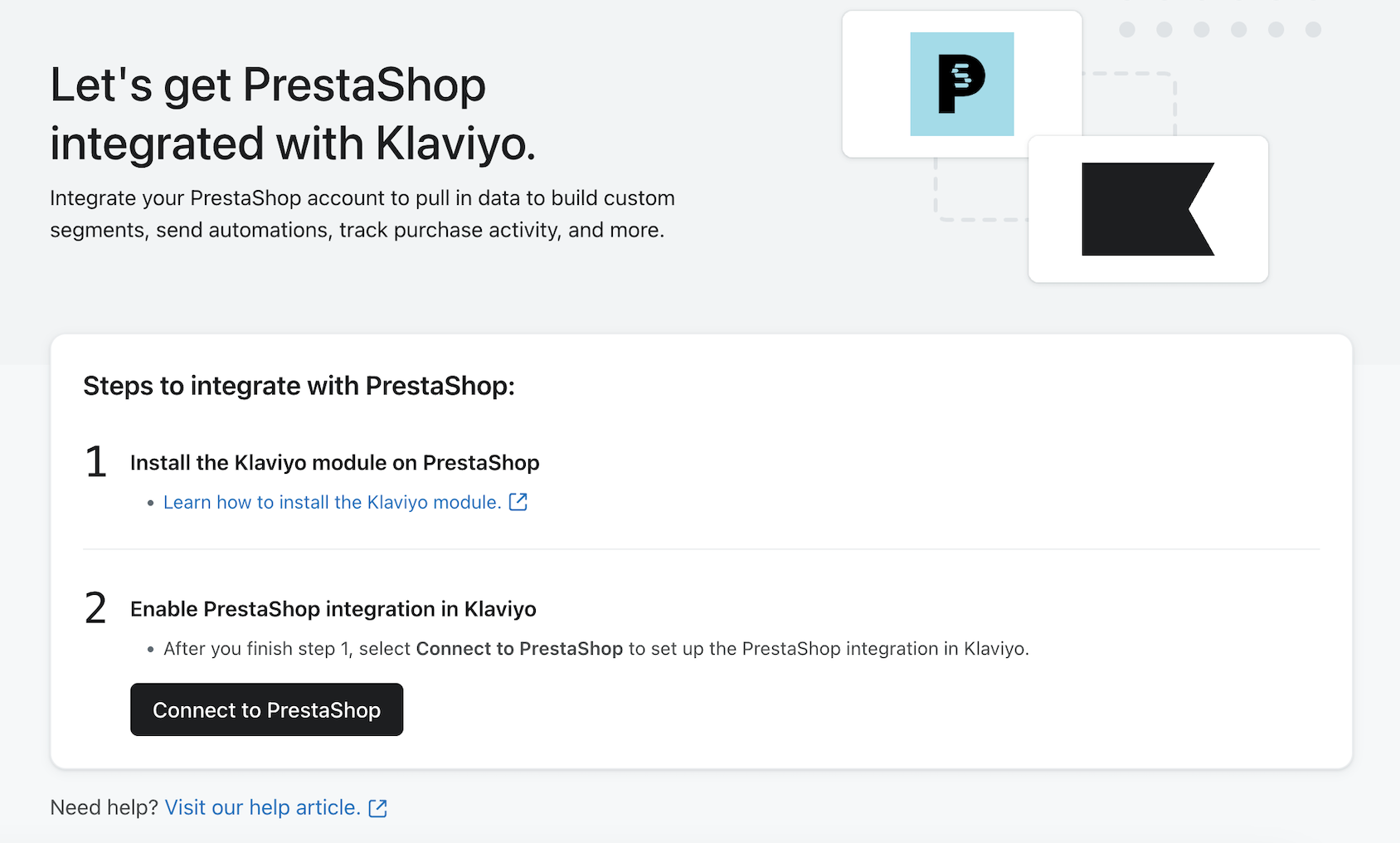 Apprenez à intégrer votre boutique PrestaShop à Klaviyo. Klaviyo est le partenaire privilégié de PrestaShop pour l’automatisation du marketing. Ce processus implique 2 étapes : l’installation d’un module gratuit (PrestaShop Automation with Klaviyo) dans PrestaShop et l’activation de l’intégration dans Klaviyo. Cet article donne aussi des informations sur le suivi de la synchronisation de vos données, la configuration des e-mails transactionnels et la mise à jour de votre module afin d’évoluer avec Klaviyo.