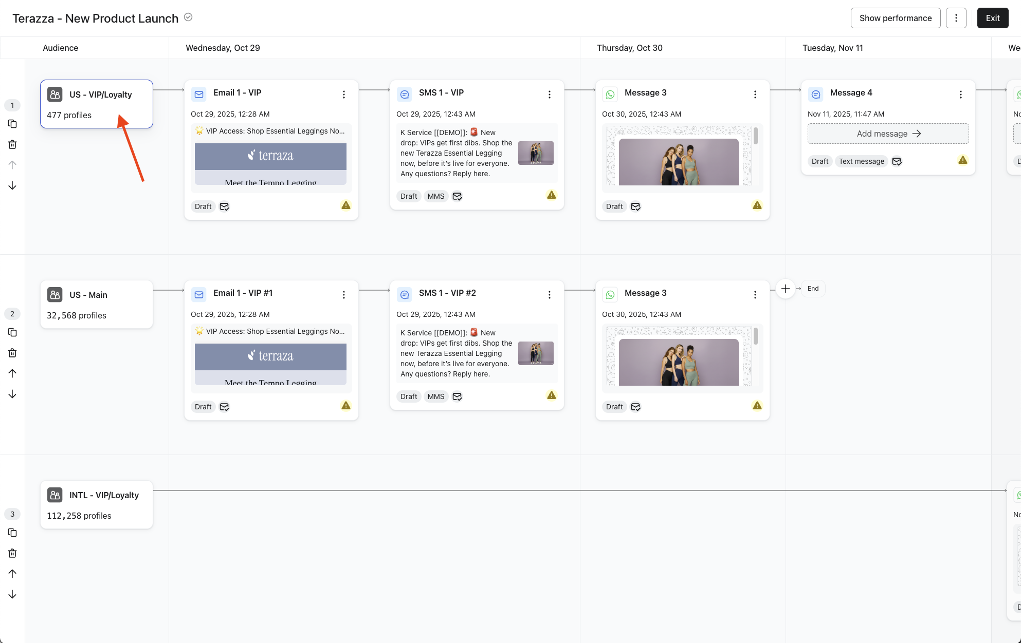 Les critères de sortie permettent d’éviter l’envoi excessif de messages en supprimant automatiquement les clients des campagnes omnicanales sur plusieurs jours, telles que les lancements de produits, les ventes flash et les notifications push de fidélité, une fois qu’ils remplissent les conditions de conversion définies. Cela permet de s’assurer que les clients convertis ne reçoivent plus de messages promotionnels, créant ainsi une expérience plus fluide et améliorant les performances globales des campagnes.