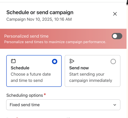 - Dans la fenêtre modale de programmation, activez le bouton bascule d’horaire d’envoi personnalisé.