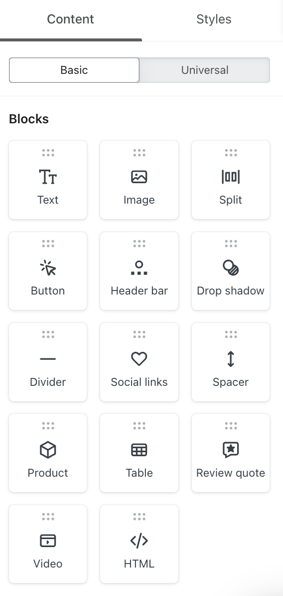 I blocchi dinamici di prodotti mostrano i prodotti in base alle tendenze aziendali (ad esempio, i prodotti più venduti negli ultimi 90 giorni) o personalizzati per ogni destinatario in base a ciò che Klaviyo prevede sarà più interessato. Scopri come creare un feed dinamico dei prodotti qui sotto. -