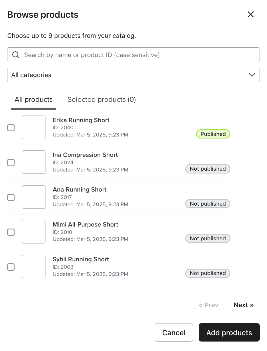 Per le diverse campagne e-mail, potresti voler scegliere a mano i prodotti giusti per funzionare in un determinato modello. All'interno del blocco prodotti, seleziona l'opzione Statico, quindi clicca su Aggiungi prodotti. Qui puoi sfogliare l'intero catalogo prodotti e scegliere fino a nove articoli da inserire nel tuo modello.
