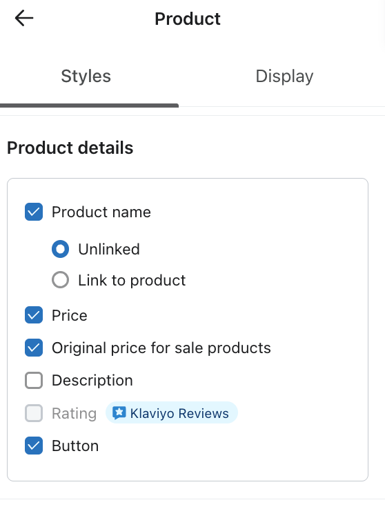 Nella scheda Stili puoi anche scegliere di visualizzare la valutazione media e la quantità di valutazioni ricevute da un prodotto. Per questo è necessario abilitare Klaviyo Reviews. Scopri come mostrare le valutazioni dei prodotti nelle e-mail con un blocco prodotto.