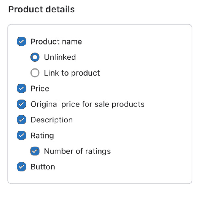 Per modificare l'aspetto di un blocco di prodotti, vai alla scheda Stili del blocco stesso. Qui puoi scegliere quali dettagli del prodotto appaiono (ad esempio, il nome del prodotto, il prezzo, il prezzo originale per i prodotti in vendita, ecc.