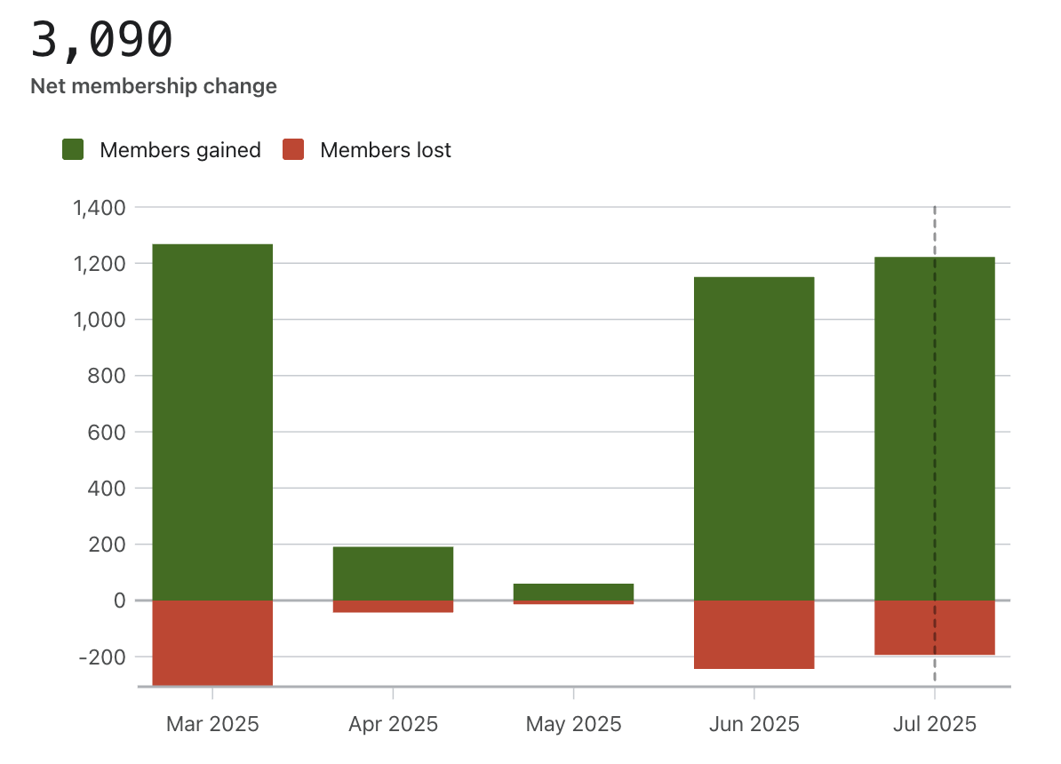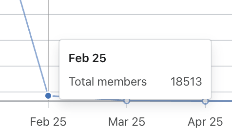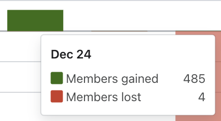 Inoltre, passando il mouse su una barra del grafico, apparirà un popup che fornisce la quantità di membri guadagnati e persi in quel particolare momento.
