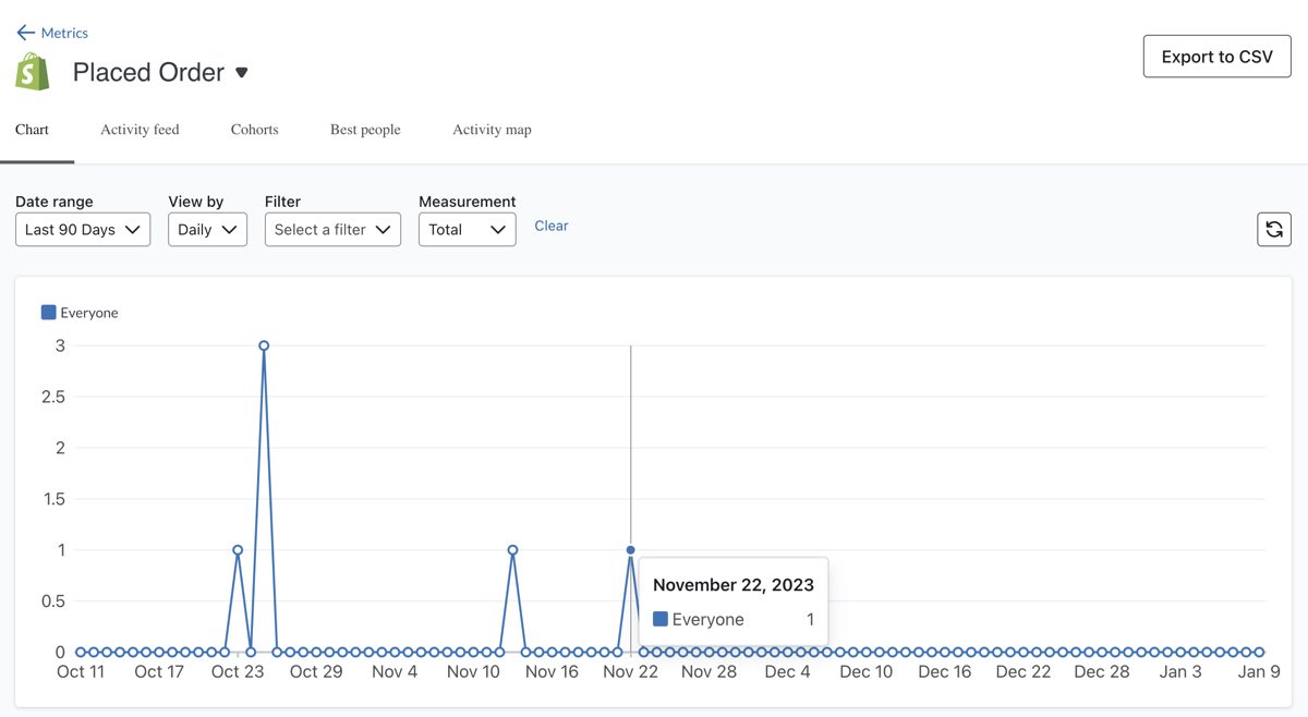Se la metrica Ordine Effettuato viene registrata, verifichi se c'è un ritardo tra il momento in cui l'evento è stato attivato dalla sua piattaforma di e-commerce e quello in cui è stato registrato da Klaviyo. Se l'evento Checkout Iniziato si è attivato, ma l'evento Ordine Effettuato è stato ritardato, qualcuno potrebbe ricevere delle e-mail dal flusso del carrello abbandonato. Può verificarlo eseguendo le seguenti operazioni: