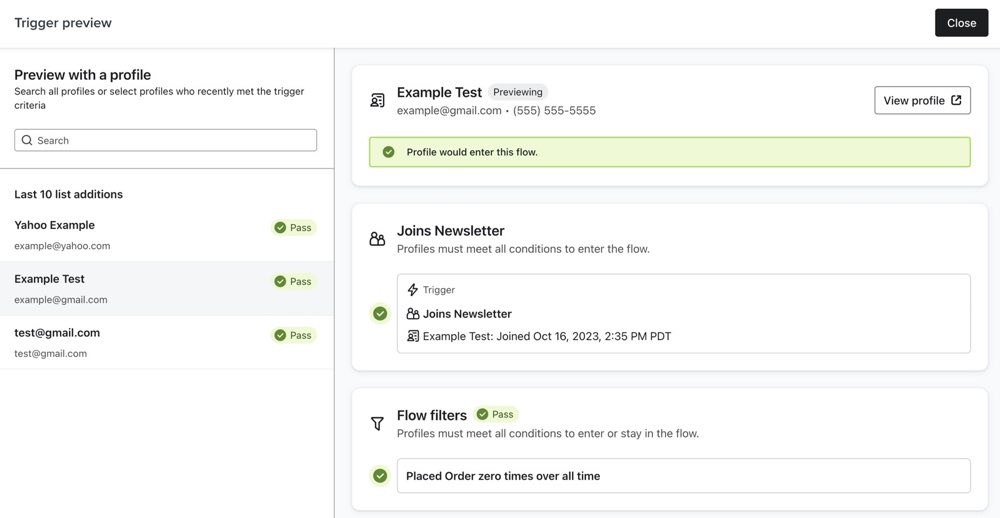 - L'anteprima del trigger mostrerà se i profili recenti stanno superando o meno i filtri di flusso e perché.