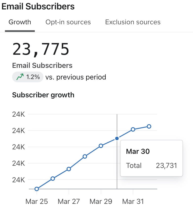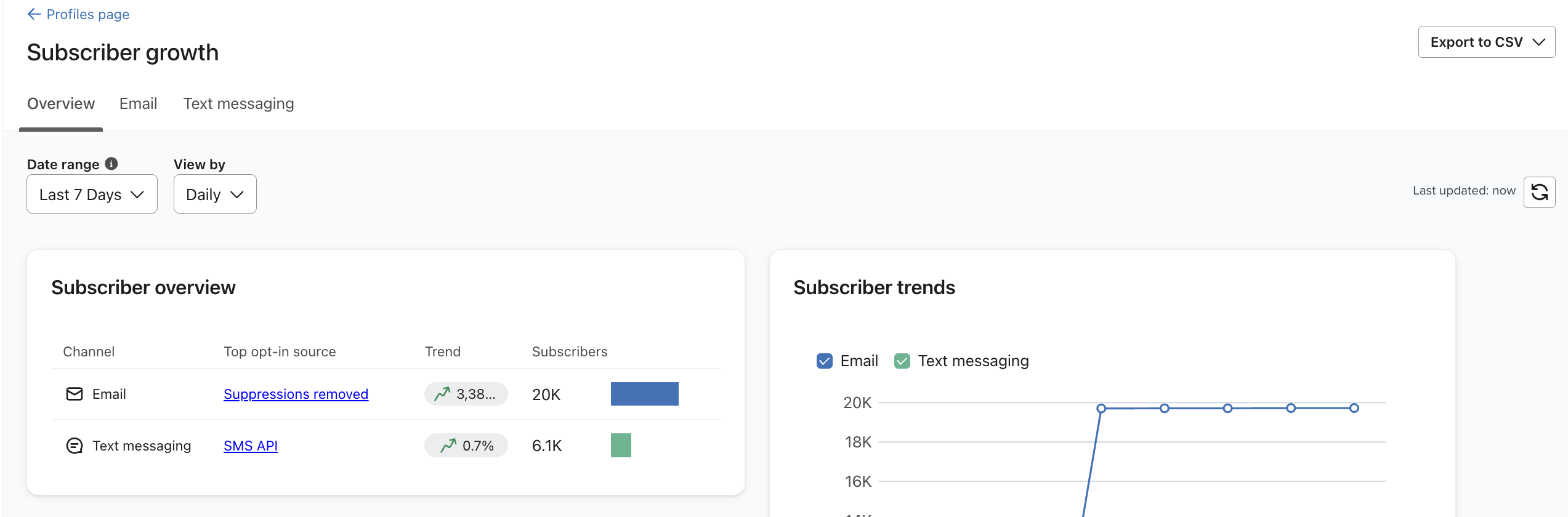 Nota che potresti notare una discrepanza tra il conteggio dei nuovi iscritti nella scheda Crescita e il conteggio dei profili nella scheda Fonti di opt-in. Questo perché se qualcuno annulla l'iscrizione nello stesso giorno dopo averla sottoscritta, non verrà considerato nel conteggio dei nuovi iscritti.