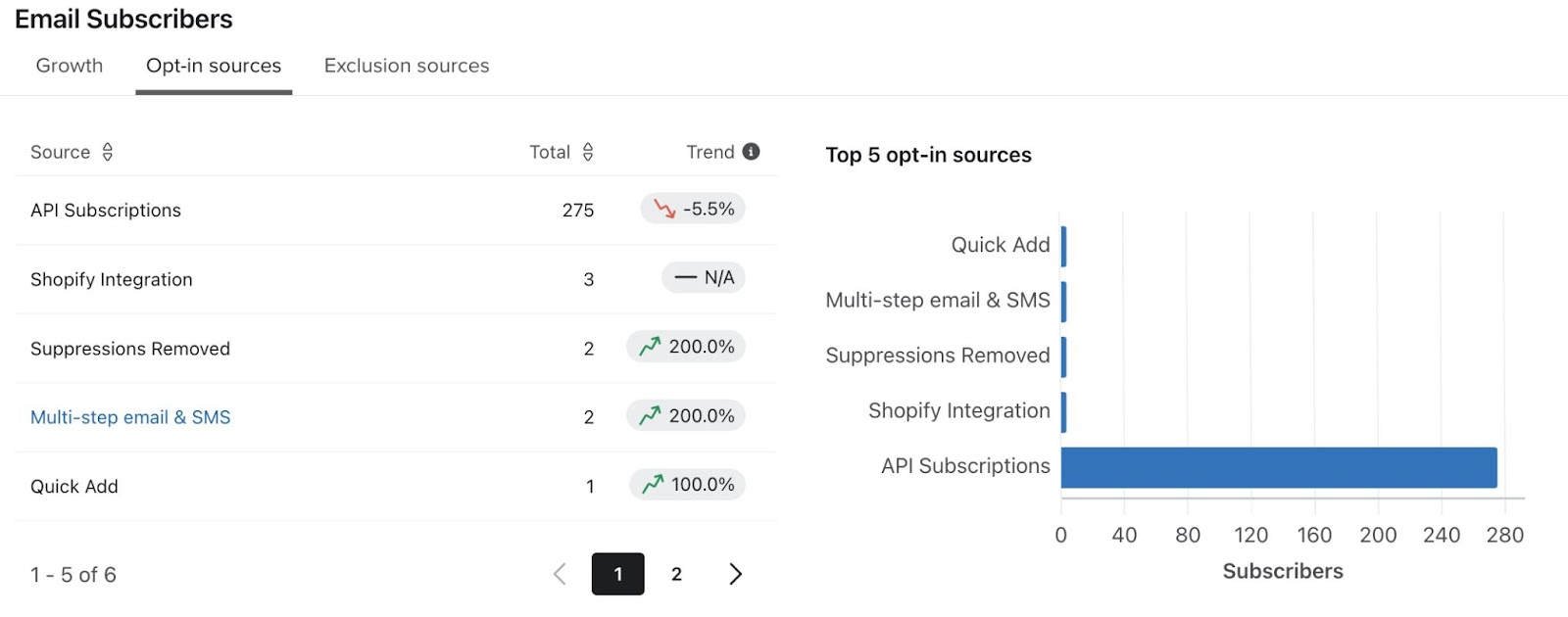 - Fonti degli opt-in, insieme al numero totale di iscritti per fonte
