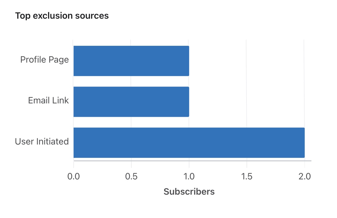 La scheda Motivi di esclusione fornisce dettagli sul motivo per cui i suoi abbonati vengono esclusi dalla ricezione del marketing. Questa scheda è utile per identificare se ci sono problemi di deliverability o di pulizia della lista, o anche potenziali problemi legati ai tipi e alla frequenza dei messaggi che invia.