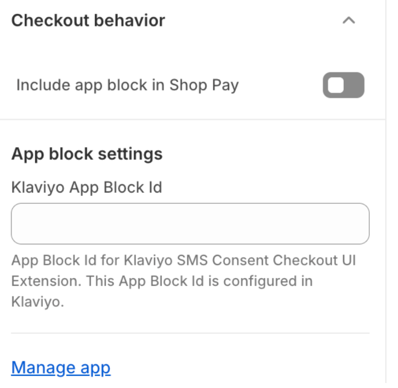 Segui le istruzioni riportate di seguito per impostare il blocco dell'app SMS. Se vuoi creare più blocchi di app per raccogliere diverse forme di consenso in luoghi diversi, devi semplicemente ripetere questa procedura. Puoi anche installare lo stesso blocco app su più pagine di Shopify.