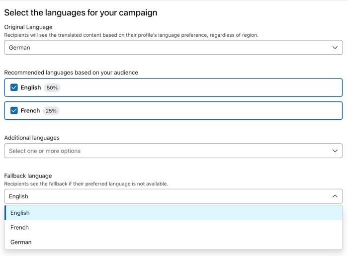 - Se lo desideri, scegli una lingua di riserva per quando la lingua preferita del cliente non è disponibile. Questo può essere diverso dalla lingua originale.