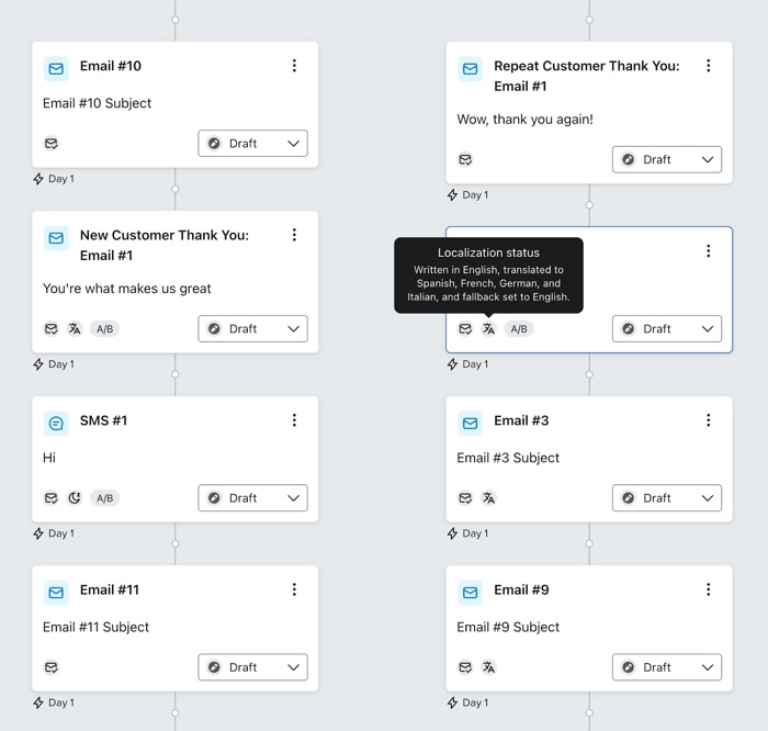 Scopri come impostare un Flusso da inviare in più lingue, a seconda delle preferenze linguistiche del tuo pubblico. Klaviyo può tradurre i contenuti delle e-mail in oltre 60 lingue.