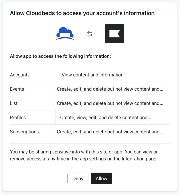 - Concedi l'accesso a Klaviyo integrazioni in Cloudbeds e clicca su Consenti accesso.