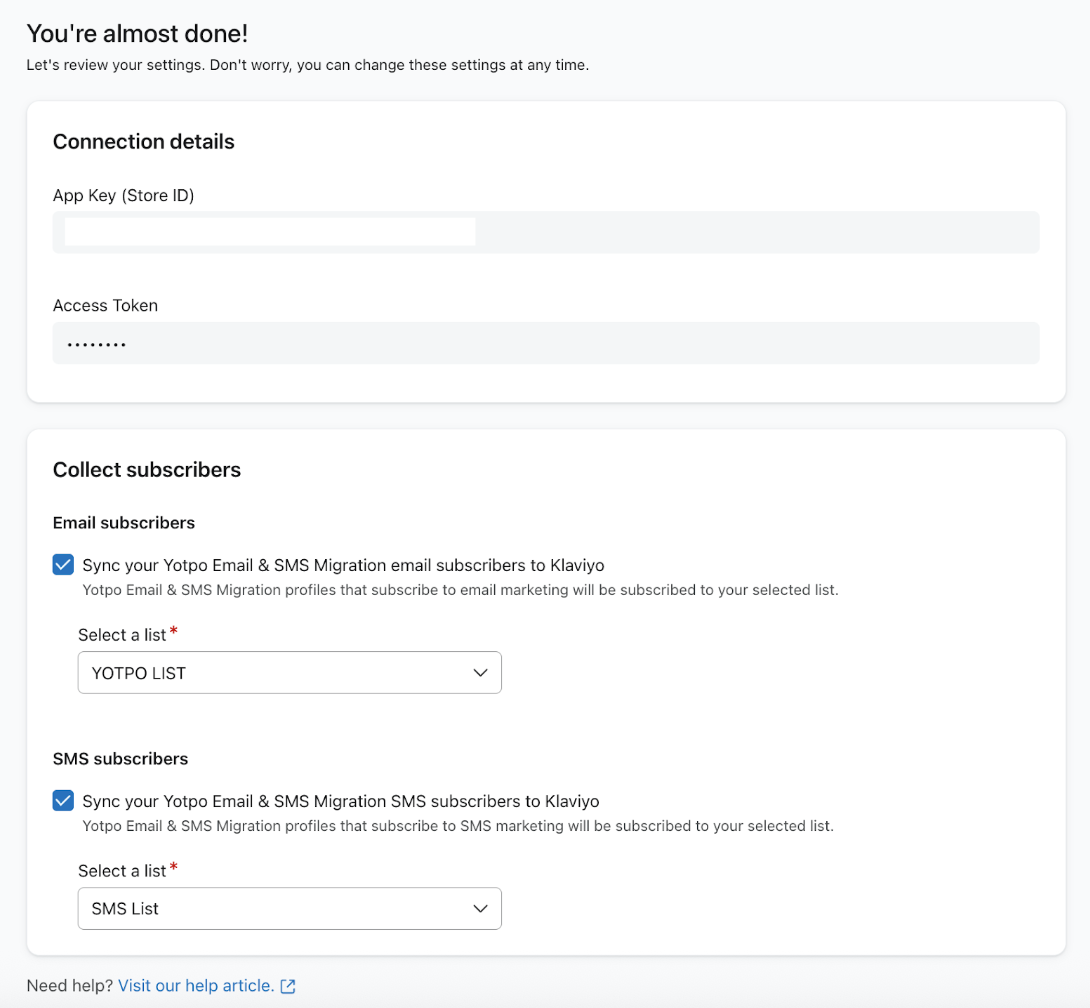 - Controlla la sincronizzazione della tua e-mail Yotpo & SMS Migrazione SMS iscritto a Klaviyo. Se non selezioni la casella, Klaviyo non sincronizzerà il consenso all'invio di SMS da Yotpo.