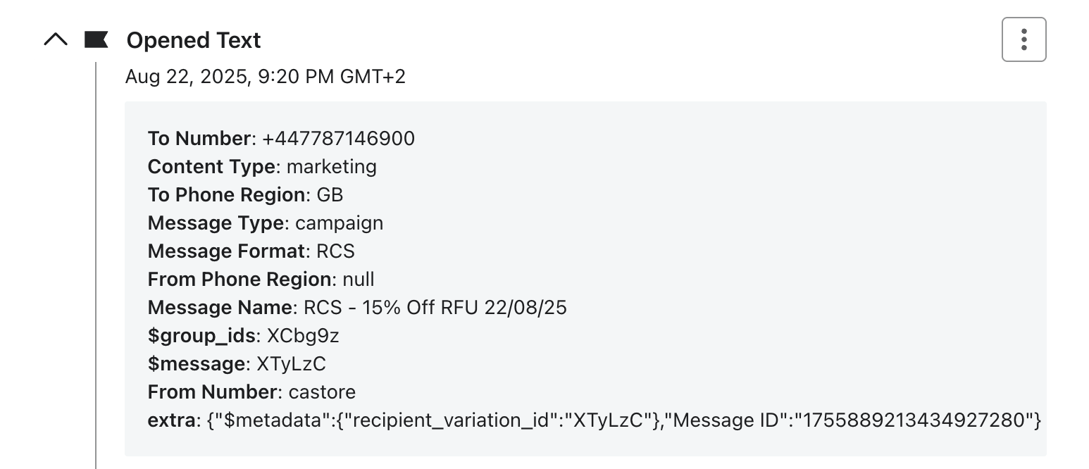 - Quando un destinatario apre un messaggio di RCS, l'evento Testo aperto viene registrato sulla timeline del suo profilo.