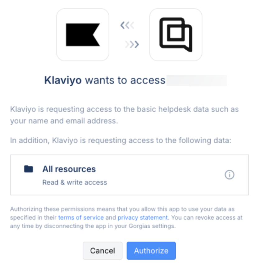 - Consenti a Klaviyo l'accesso a tutte le risorse cliccando su Autorizza.