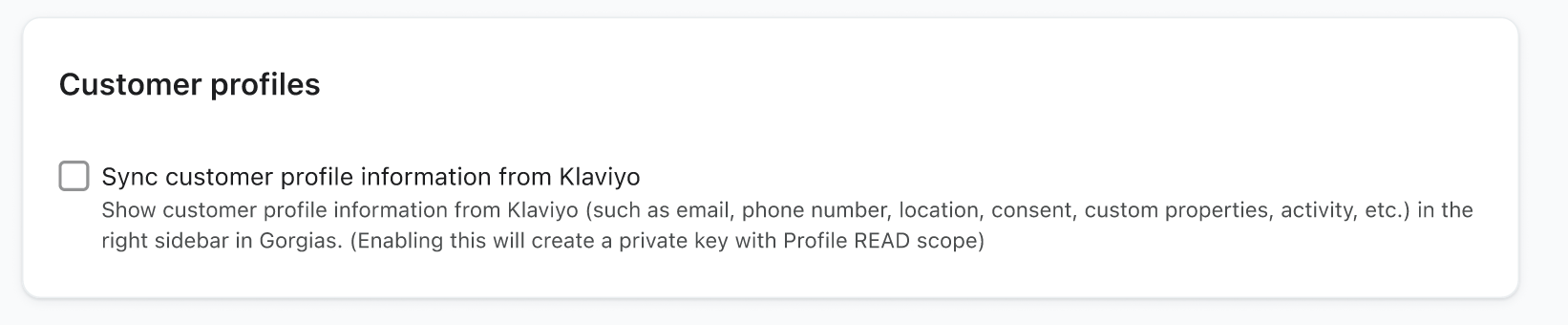 - CONSIGLIATO: Controlla Sincronizza informazioni profilo cliente da Klaviyo a Gorgias per inviare a Gorgias indirizzi e-mail, numeri di telefono, Proprietà del profilo e altro ancora. Questi dati verranno sincronizzati solo se hai abilitato gli SMS o le recensioni.