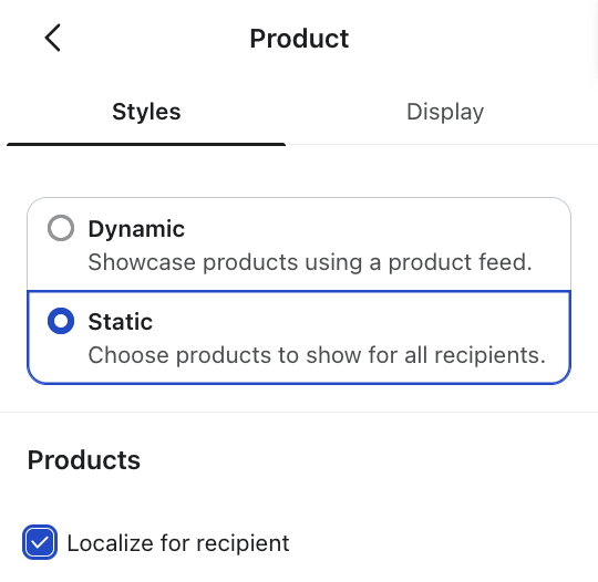 - Dal selettore del blocco di prodotti statici, scegli un catalogo che tenga conto delle impostazioni locali. Per l'integrazione di Shopify, il nome del catalogo è "Shopify: predefinito"