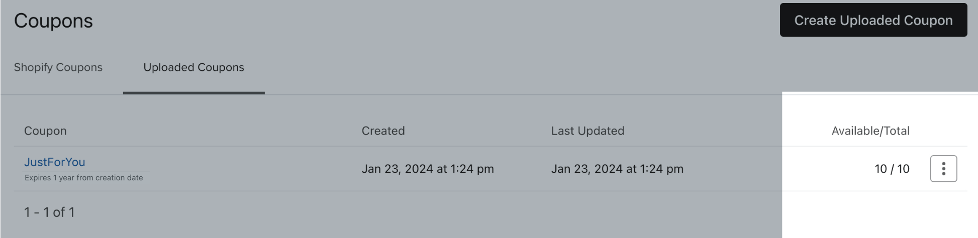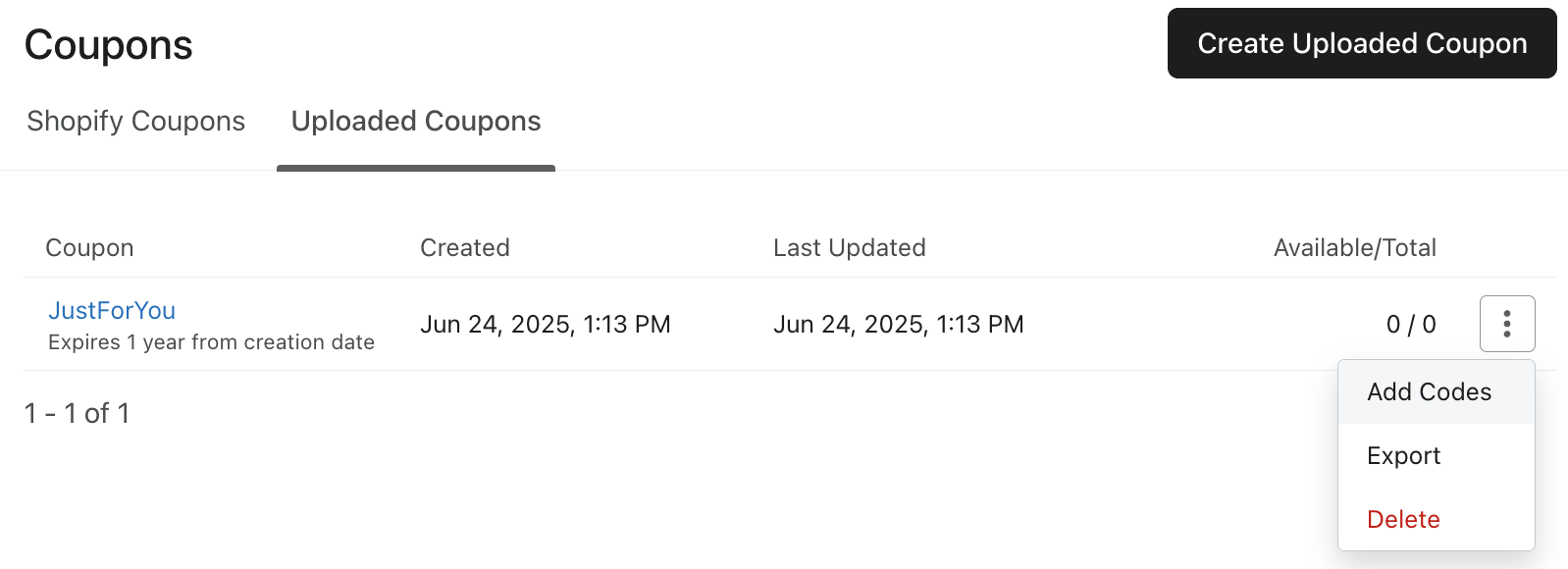 - [アップロード済みクーポン] のタブで、該当するクーポンの横にある3点リーダーをクリックし、[コードを追加] を選択します。