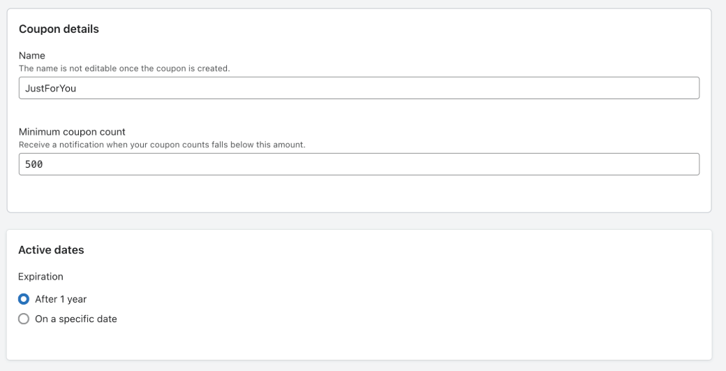 クーポンの名前、最小クーポン数、有効期限(例:1 年後、または特定の日付)を選択します。