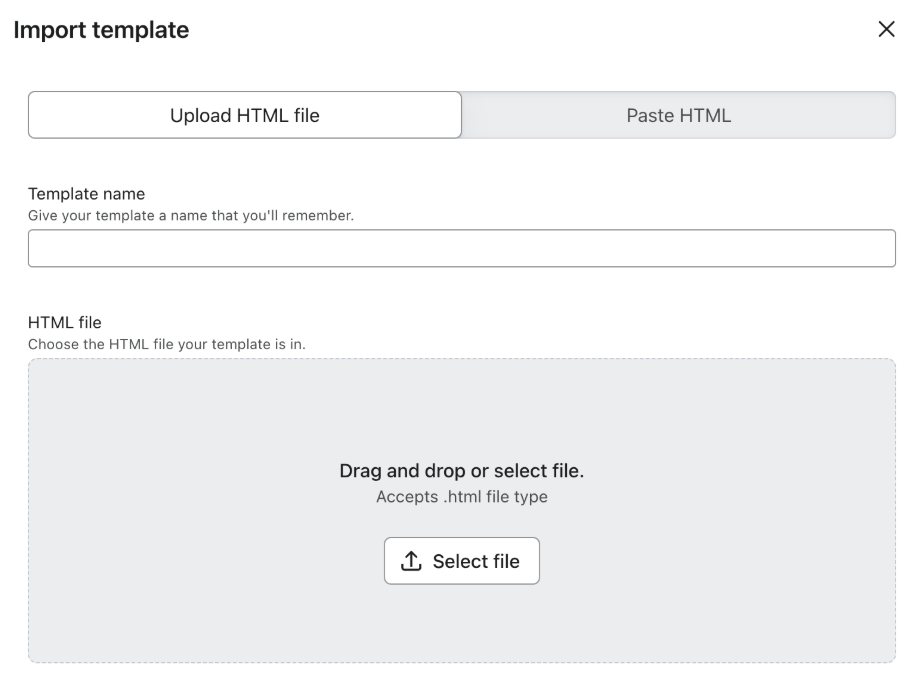 - [テンプレートをインポート] モーダルで、コンピューターから先ほど保存した HTML ファイルを選択して、ファイルをアップロードします。
