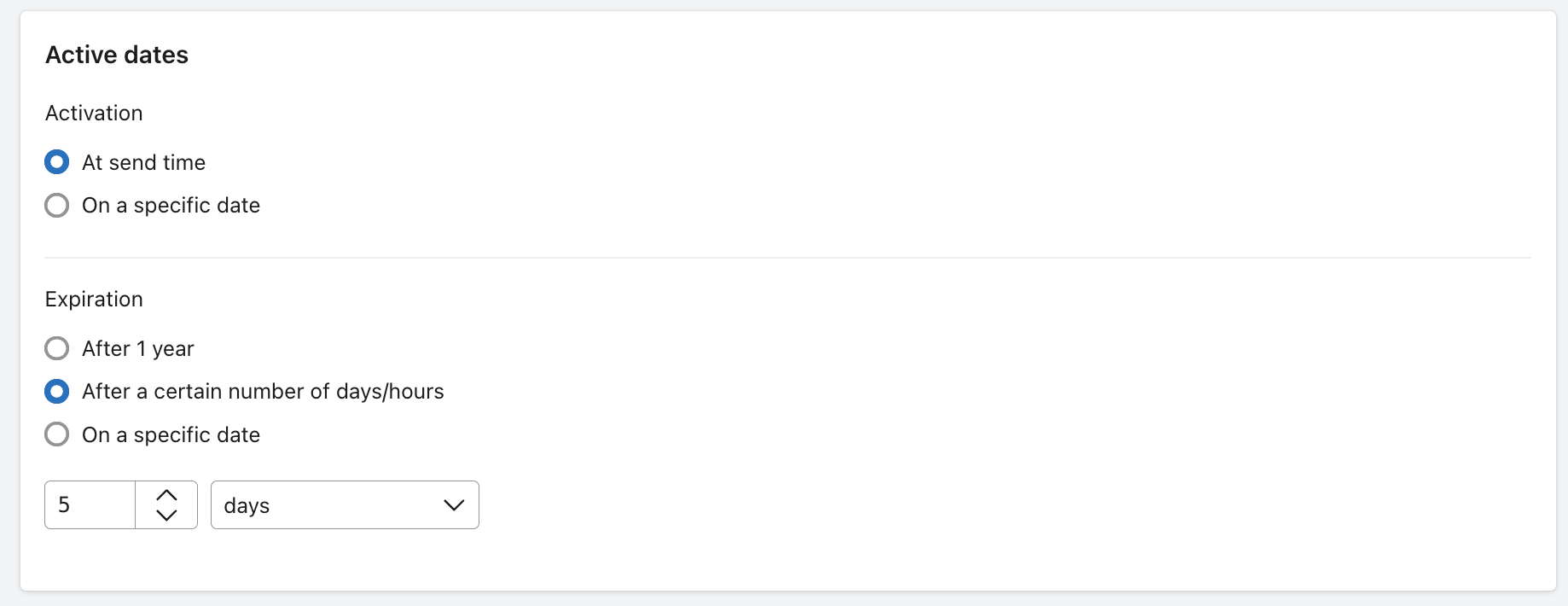 クーポンの有効期限を選択してください。キャンペーンメッセージで使用されるクーポンと、フローメッセージで使用されるクーポンには、それぞれ異なるオプションがあります。Klaviyo では、日付は UTC タイムゾーンで設定されていることに注意してください。一方、Shopify は Shopify ストアのタイムゾーンに基づいて有効期限の日時を設定するため、同じクーポンでも Klaviyo と Shopify で異なる有効期限が表示される場合があります。- キャンペーン