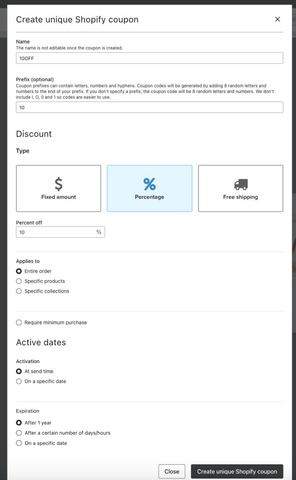 - Shopify クーポンを ユニーククーポンのタイプとして選択します。