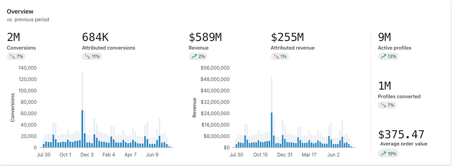 コンバージョン概要ダッシュボードでは、Klaviyo に帰属する値を含む、総コンバージョン数と収益を分析できます。また、異なるコンバージョン数を達成しているプロファイルの数と、そのプロファイルに関連付けられる総収益を確認することもできます。このダッシュボードでは、コンバージョンに基づいて特定セグメントをターゲットにすることで、マーケティング活動を最適化し、コンバージョン率を向上させることができます。