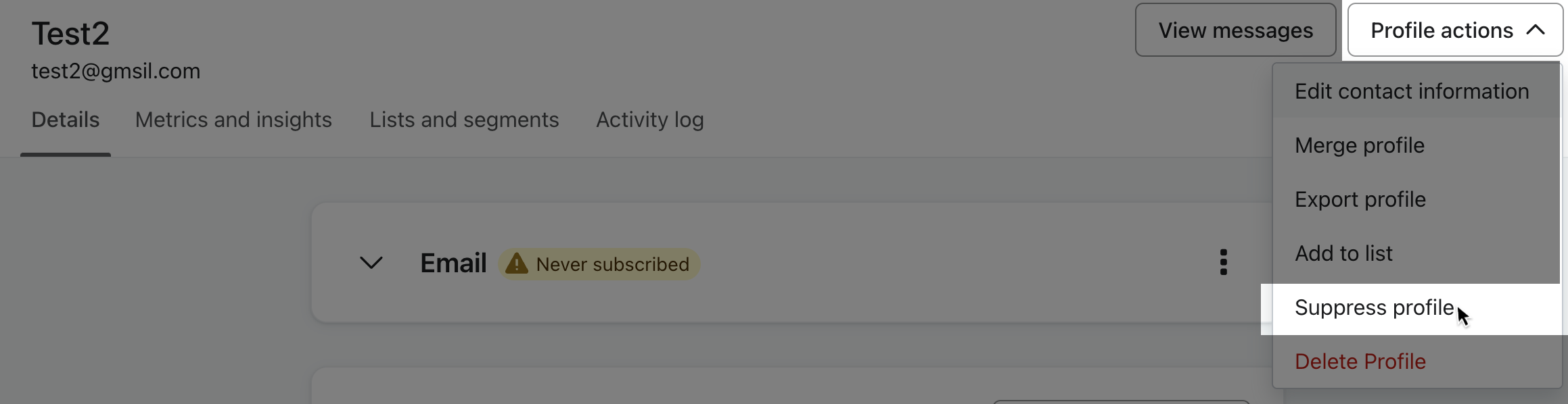 プロファイルが送信抑制済みになると、そのプロファイルはマーケティングメールを一切受け取れなくなります。Klaviyo は、送信時に自動的に送信抑制済みプロファイルをスキップします。また、送信抑制済みプロファイルは、課金プランのプロファイル数にもカウントされません。