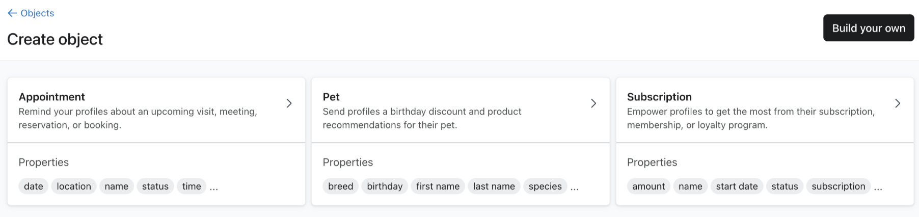 Klaviyo でオブジェクトの作成を始めるには、[コンテンツ] > [オブジェクト] に移動し、[オブジェクトを作成] をクリックします。