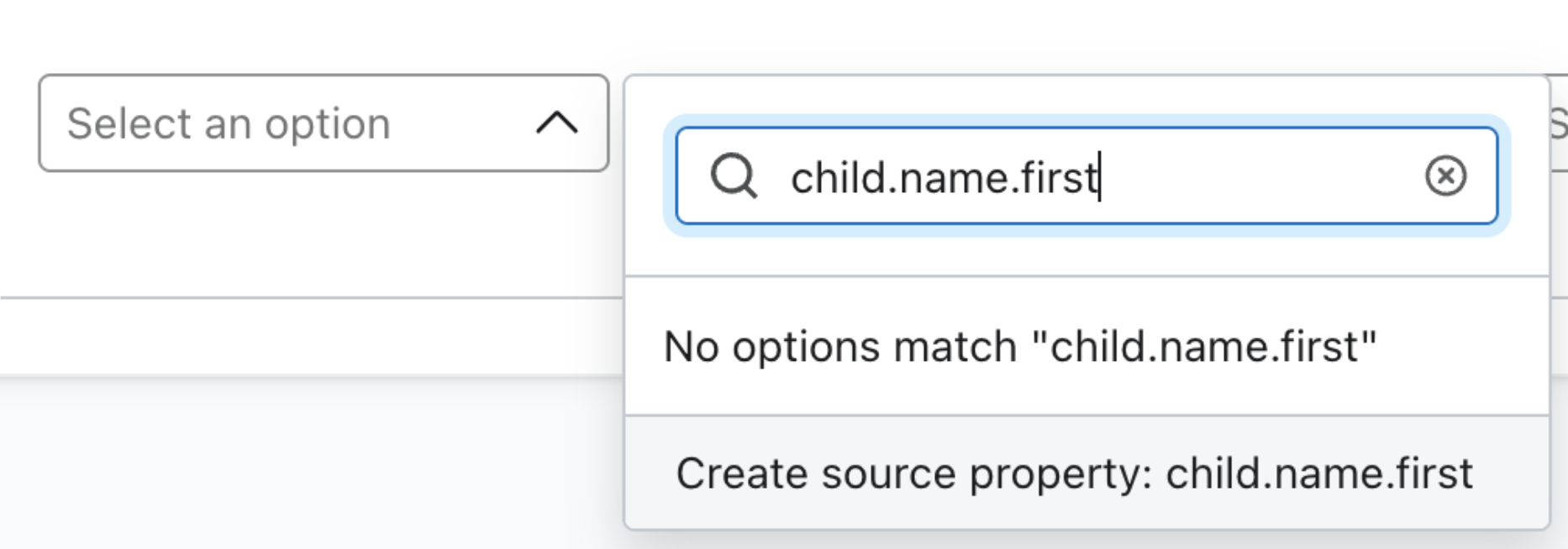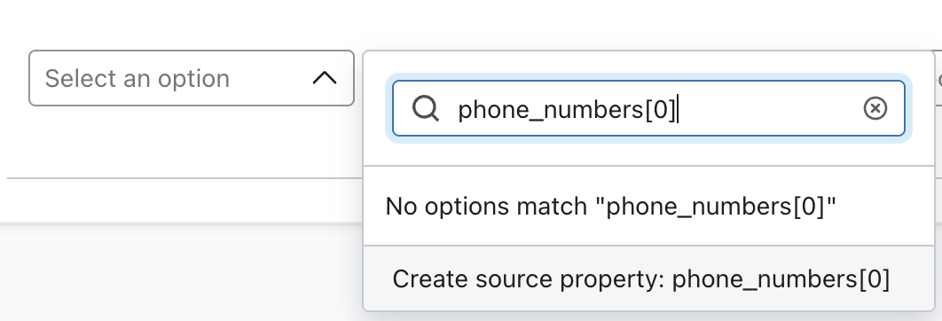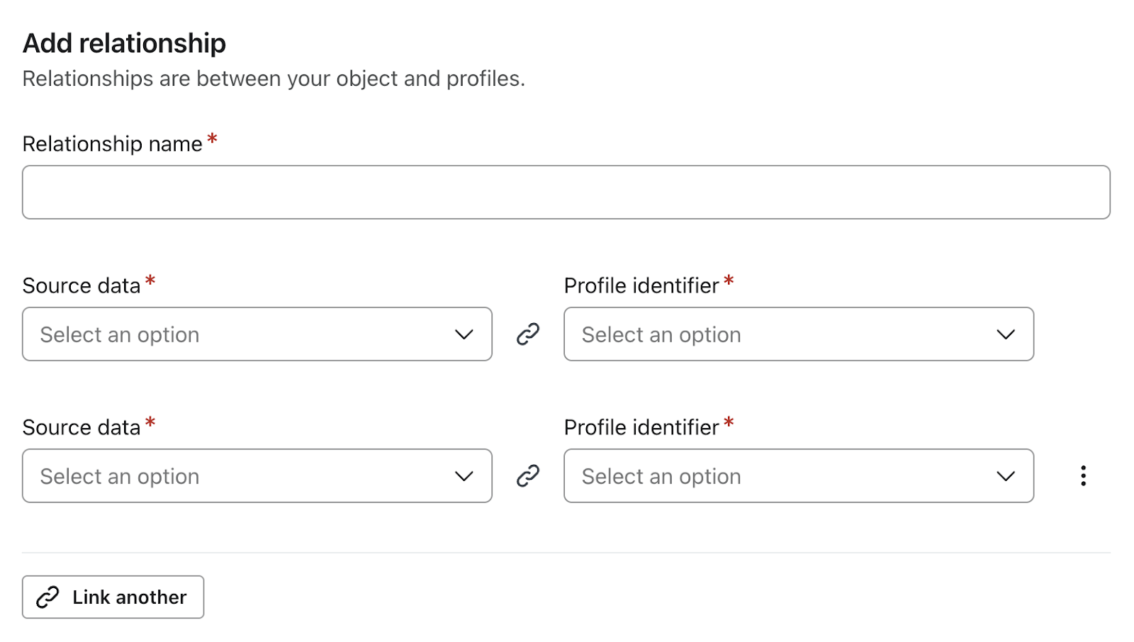 プロファイル識別子(Eメール、電話番号など)を設定します。 これは、オブジェクトをプロファイルに関連付けるためのデータソースに含まれている必要があります。プロパティと識別子のペアを追加するには、「Link another property 」ボタンを使用します。